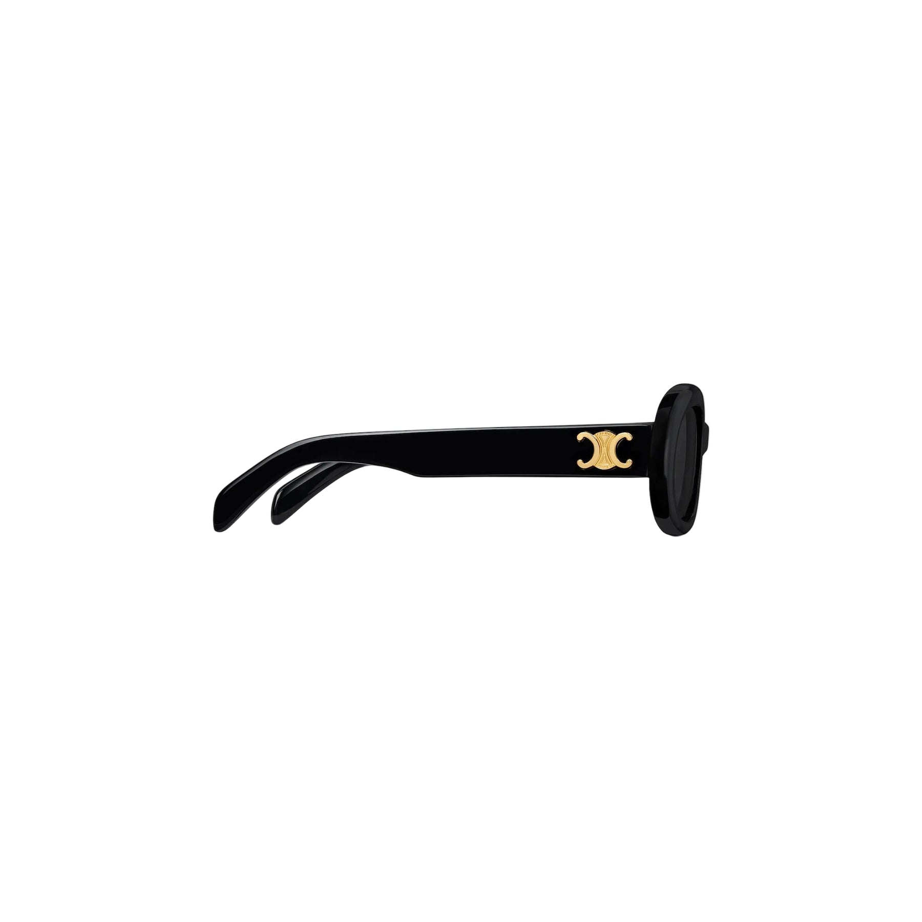 Óculos de sol com armação oval em acetato, combinando elegância atemporal e design sofisticado. As lentes em tom fumê oferecem proteção total contra os raios UVA e UVB, garantindo conforto visual e segurança. O acabamento é valorizado pela assinatura Triomphe em dourado aplicada nas têmporas, um detalhe icônico que traduz luxo e identidade.